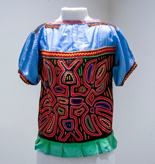 Mola is the word used to describe the colorful cotton fabric and thread panels created and still worn today by the Kuna women of Panama. Some molas are purely abstract, consisting of shapes, colors, and lines. These designs have their roots in body painting, a tradition the Kuna people once practiced to decorate themselves. When the Europeans arrived, however, the art of body painting was discouraged. The Europeans introduced the Kuna people to cloth, scissors, thread, and Western-centric values. From that point on, the designs were expressed through clothing.